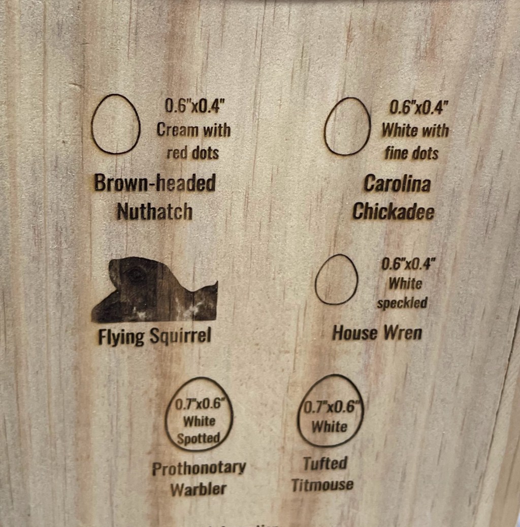 Nest boxes built to provide specific species criteria and providing occupant information. No toxic finishes or predator handles.
